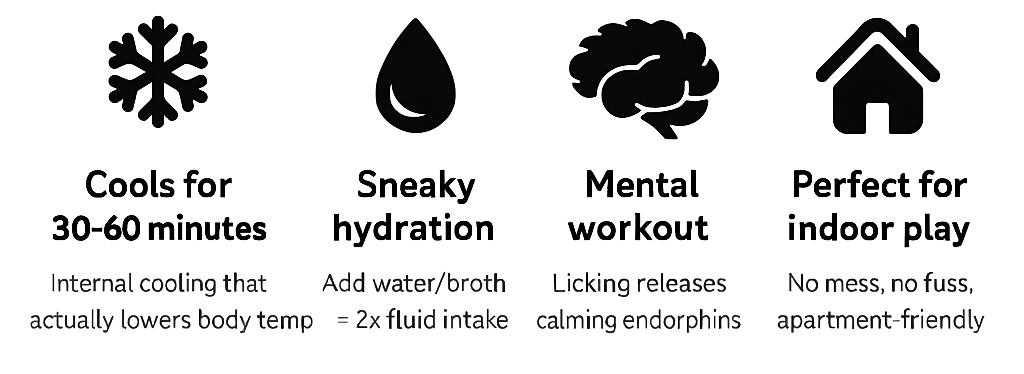 Ice cubes are gone in seconds and can be choking hazards. Freezbone lasts 30-60 minutes, provides mental stimulation through licking, and lets you add nutritious (hydrating) ingredients. It’s the difference between a snack and a full enrichment experience.